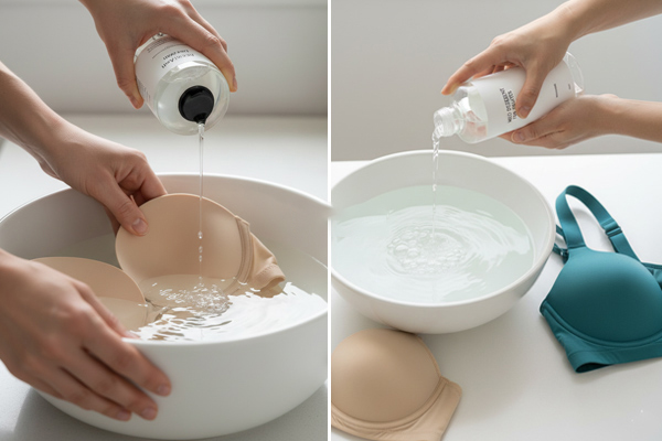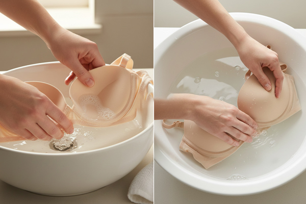 ابتدا ظرف با اندازه مناسب را با آب ولرم پر کنید و کمی شوینده ملایم در آن بریزید؛ لازم نیست خیلی کف درست کنید. سپس سوتین را در آب قرار داده و به آرامی فشار دهید تا کاملاً خیس شود. آن را به مدت ۱۰ تا ۱۵ دقیقه در آب رها کنید. بعد از آن به جای مالش سخت، با کف دست خود به آرامی روی سطح کاپها و قسمتهای اسفنجی فشارهای ملایم و دورانی وارد کنید تا آلودگیها خارج شود. نواحی پشت کاپها و بندها را نیز فراموش نکنید.