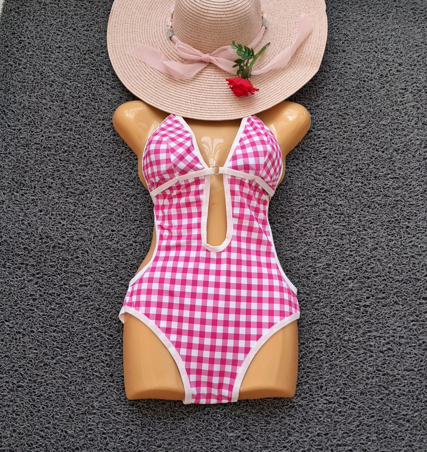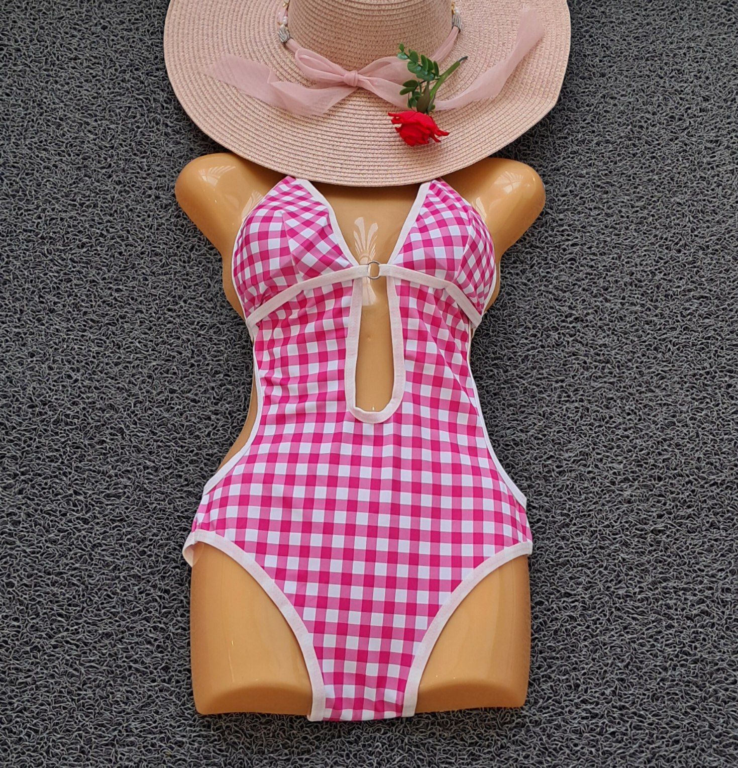 مایو زنانه کاپ متحرک چهارخونه صورتی پشت باز (جنس اب گریز)