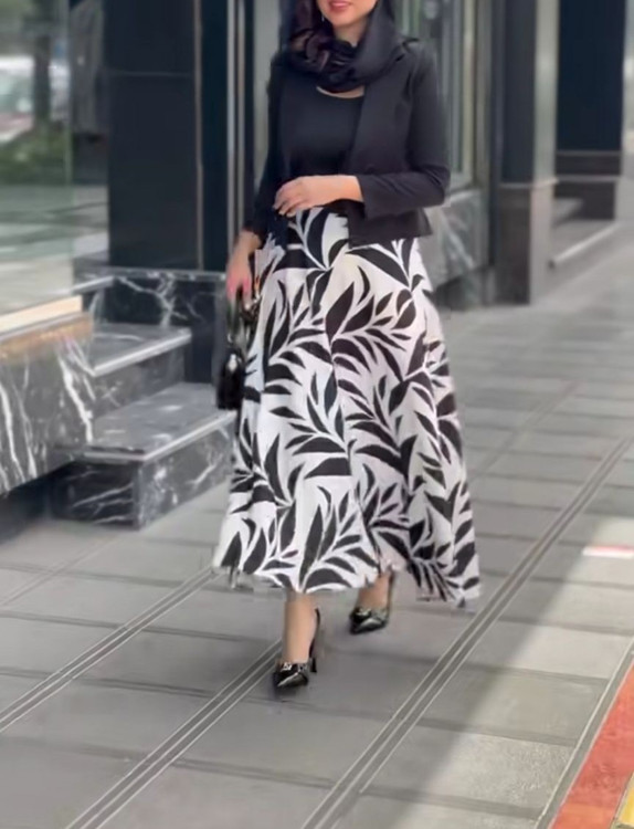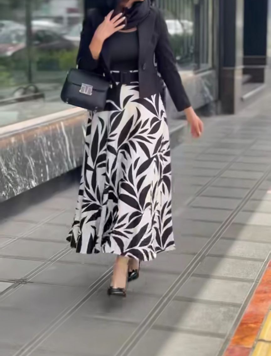 دامن زنانه پارچه ای طرحدار کلوش مجلسی طرح برگ